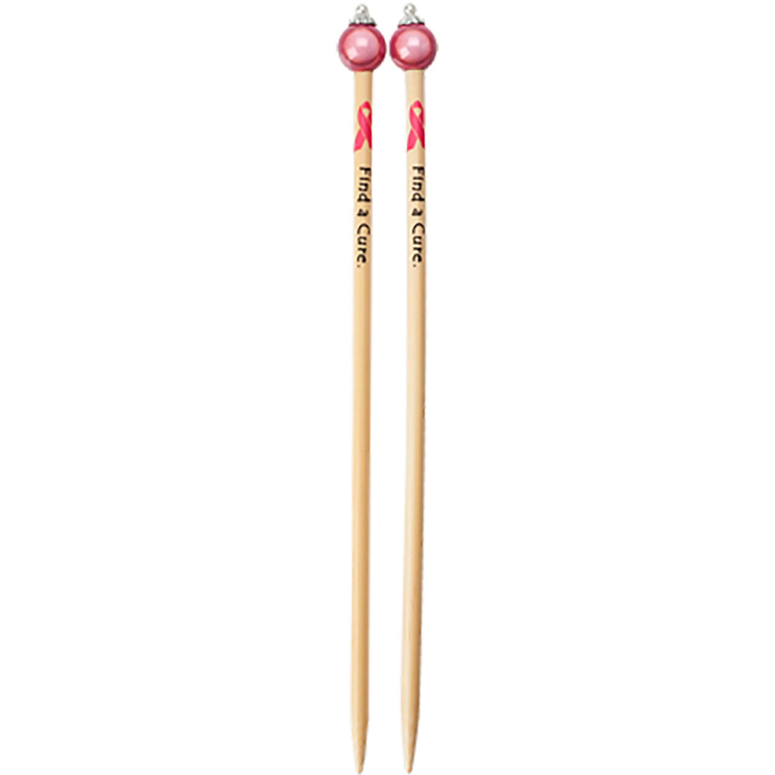 Our 9″ (23 cm) “Find A Cure.” single points are embellished with a pink, miracle bead cap. The design is transferred (NOT painted) and guaranteed to not come off on your yarn or clothing.